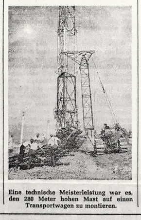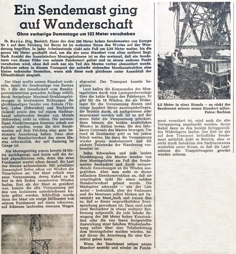 Zu diesem Zweck verschoben die Europe-Leute den südlich gelegenen Mast ihres Senders um ganze 102 m, und zwar in aufgebautem Zustand ! Dies war eine, so erstmals ausgeführte, technische Glanzleistung. Europe Nr. 1 konnte fortan seine Frequenz weiter benutzen (und zwar bis heute; aus anderen Gründen wurde sie leicht erhöht auf 183 kHz).