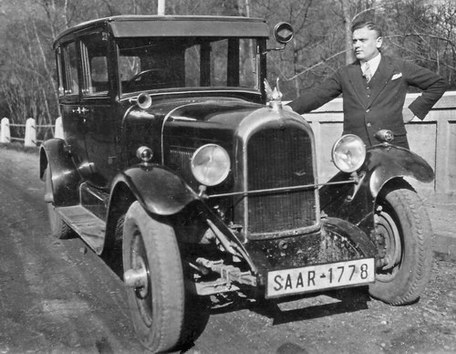 Citroën: Auf dem Foto unten steht Nikolaus Groß neben seinem Taxiwagen (wahrscheinlich ein Citroën), den er kurze Zeit später für sein Unternehmen anschaffte. Das Foto wurde im Jahr 1929 aufgenommen. Rechts daneben ein weiterer Citroën, aufgenommen 1937/38. Er war in Neunkirchen zugelassen. Fotos: Egon Gross, Lebach und Jürgen Dippe, Neunkirchen.