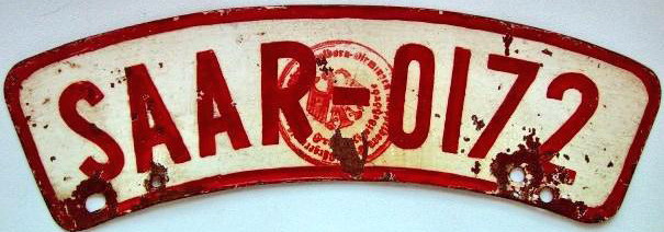 Die ersten Autos im Saarland erhielten von etwa 1920 an Nummernschilder, die aus den vier Buchstaben SAAR und einer bis zu fünfstelligen Zahl bestanden. Diese Regelung wurde trotz der wechselhaften Geschichte unseres Landes bis zum Ende des Zweiten Weltkriegs unverändert beibehalten. Auch im Jahr 1945 behielten die SAAR-Kennzeichen zunächst ihre Gültigkeit, und zwar über das Kriegsende hinaus bis zum 25. Dezember 1945. Im Laufe des Jahres 1945 wurden bei Neuzulassungen anfangs sogar noch neue Autonummern mit "Saar" zugeteilt (einen Auszug aus einem Kfz-Brief, der dies belegt, sehen Sie auf der Seite Kfz-Kennzeichen im dritten Bild von oben). Erst am 25.12.1945 wurden sie durch "SA"-Kennzeichen ersetzt (Näheres darüber auf derselben Seite unter Punkt 2).