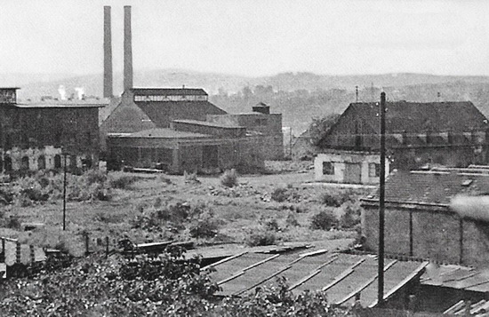 Oben: Das Gelände der Fenner Glashütte im Jahr 1949; ganz links das Glasmagazin, daneben die Ofenhalle und rechts die Schleiferei