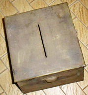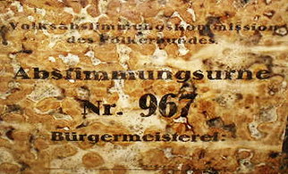 Originale Abstimmungs-Urne der Volksabstimmungskommission des Völkerbundes; im rechten Bild die Aufschrift auf der Vorderseite dieser Urne.