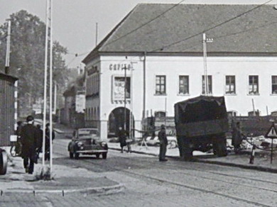 im Bild abzweigt), gegenüber dem alten Postgebäude, welches rechts