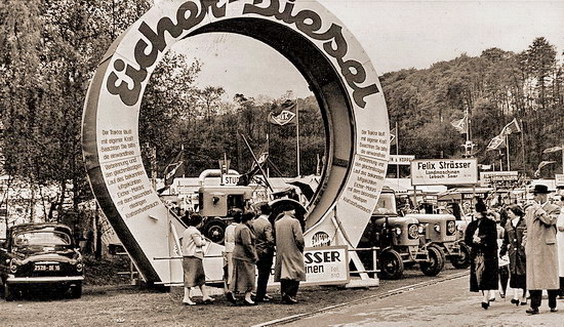 Oben: Auf dem Ausstellungsgelände war auch das berühmte Eicher-Rad aufgebaut, welches die Firma zu Werbezwecken gebaut hatte. Es war erstmals 1951 auf der DLG-Ausstellung in Köln zu sehen.
