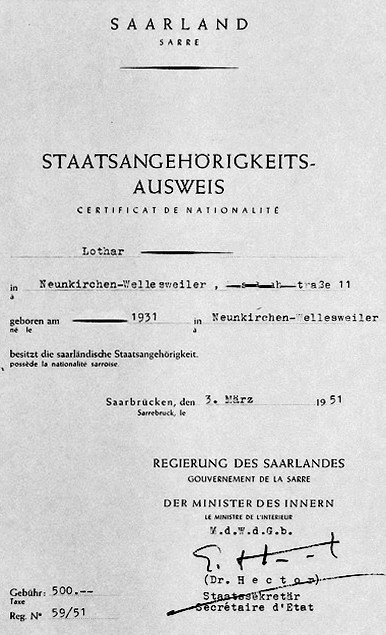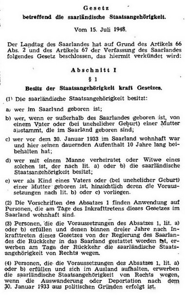 Après la création de l’Etat sarrois le 8 novembre 1947, la loi sur la nationalité sarroise ("Staatsangehörigkeitsgesetz") entra