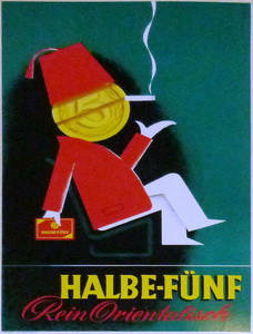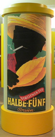 Lasso-Packung (oben) und das Halbe-Fünf-Plakat (Entwurf: Bruno Koppelkamm 1949) auf der Litfaßsäule sind im Historischen Museum Saarbrücken zu sehen.