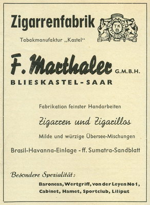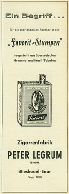 Zigarrenfabrik Peter Legrum GmbH, Von-der-Leyen-Straße 16: Favorit-Stumpen; Vorgänger war wahrscheinlich Cigarrenmacher August Legrum, Blieskastel 164.