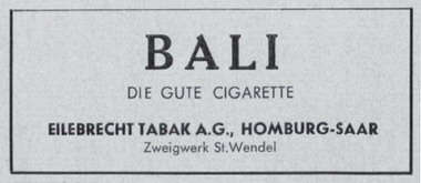 Gegen Ende der 40er Jahre wurde in der St. Wendeler Fabrik Kockler zusätzlich eine Zigarettenfabrik gegründet: Ein Zweigwerk der Tabakfabrik Eilebrecht AG, Bruchmühlbach (die auch in Homburg ansässig war) produzierte dort nun die BALI - Zigaretten.