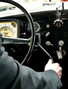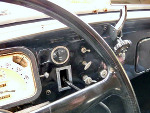 Das erste Bild in der senkrechten Reihe oben zeigt den aus dem Armaturenbrett herausragenden "Kuhschwanz-Schalthebel". Der Fahrer hat gerade den ersten Gang eingelegt; er war rechts unten, der Rückwärtsgang