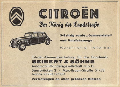 Auf unserer Seite d) PKW (französpanische Fabrikate) finden Sie weitere Citroën-Typen sowie alle anderen französischen Automarken, die damals im Saarland gefahren wurden. Im folgenden Text beschreiben wir den Werdegang des Citroën Traction Avant. Der namensgebende französische Ausdruck "traction avant" bedeutet "Frontantrieb"